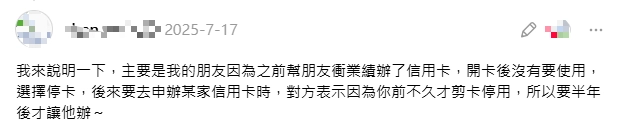 如果你是幫朋友衝業績而辦卡或一時衝動後悔了,建議至少持有半年至一年以上再停,如果你持卡時間太短,可能會銀行標記為「無貢獻客戶」或「洗新客禮物奧客」,不僅會影響未來申請該行其他貸款的過件率,甚至可能被追回首刷禮價值。