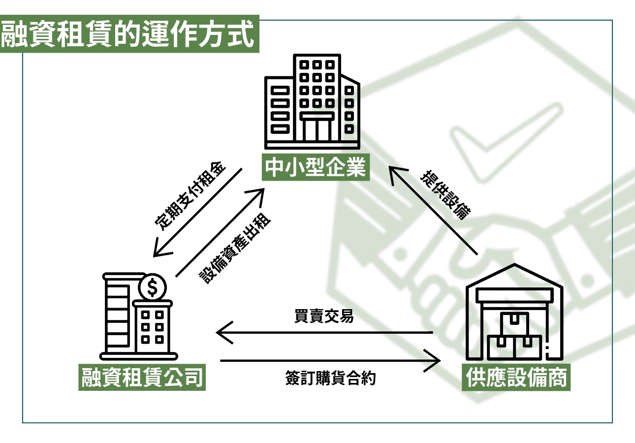 承租人與出租人達成協議後,由出租人向供應設備商(出售人)購買承租人指定的設備,約定期限內,承租人要定期支付租金。期限結束後,承租人可以選擇續租、買斷或歸還設備。