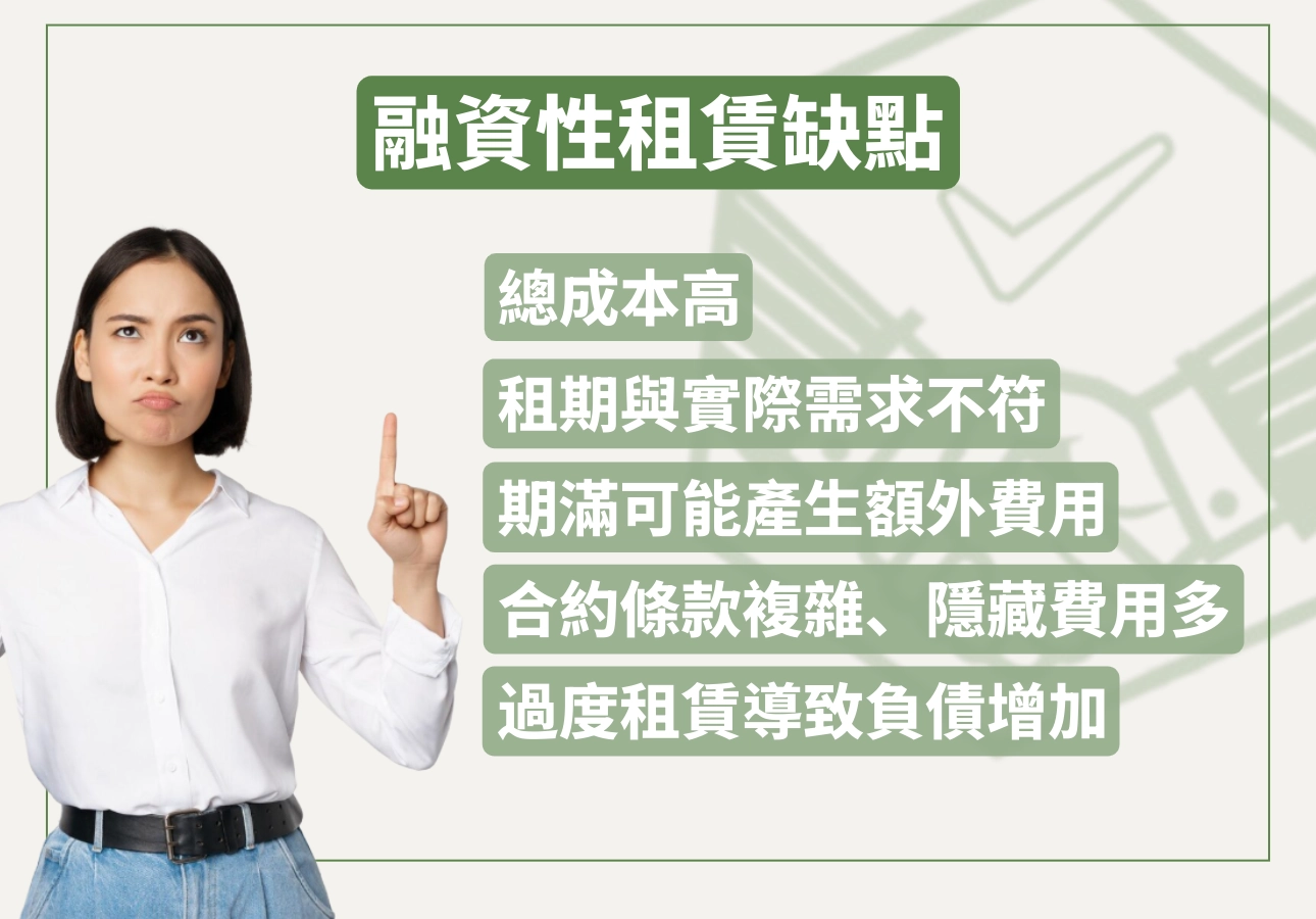 企業透過融資租賃取得設備,可以不用一次支付大筆費用,但如果付款計畫沒有做好安排,仍可能造成資金周轉困難。尤其是同時租用多項設備時,每月租金累積成固定支出,如果營業不如預期,就容易陷入「現金流緊張 → 繼續租 → 債務累積」的惡性循環。