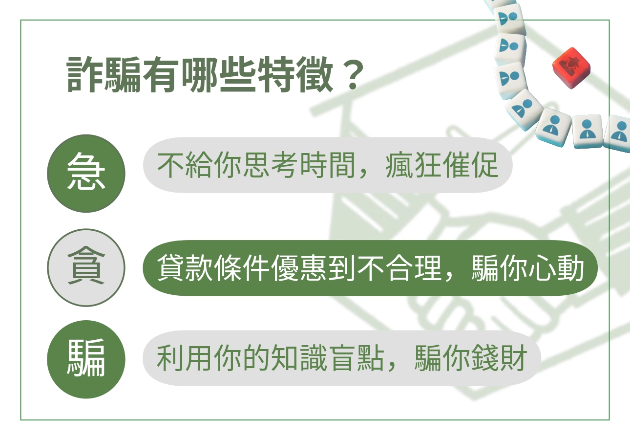 謹記以上三大口訣,在面對可疑人士的時候,如果他不給你思考時間、條件優惠到可疑(像是年利率 3% 可貸 100 萬、無需抵押品)、打著「業內都是這樣操作的」的口號——那就是詐騙集團!