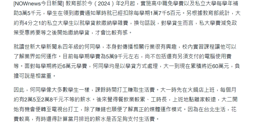 畢業後就面臨還款的問題,對於剛出社會的學生其實是一個很大的壓力,因為除了學貸,他們也要考慮日常、租屋費用等開銷支出,每個月的薪水扣掉這些根本沒剩多少。